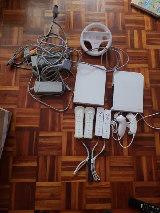 Pack de consola Wii en color blanco, listo para jugar. - Incluye consola Wii. - Volante para juegos. - Mando Wii Remote y Nunchuk. - Cables de conexión. IMPORTANTE el precio es de una consola, se pueden comprar las 2, el pack de una consola sería la consola, los cables de conexión 2 mandos ,uno confunda y otro sin funda y un manchuco el volante es opcional, no obstante se puede negociar los componentes[( posibilidad de preparar la paz a tus copias de seguridad) subiría 10 € el precio, y posibilidad de poner un disco duro externo]
