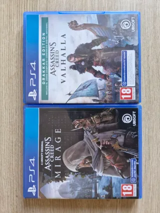 Se venden dos videojuegos de la saga Assassin's Creed para PlayStation 4 y 5. - Assassin's Creed Valhalla (Edición Drakkar). - Assassin's Creed Mirage (A Ubisoft Original). - Ambos juegos son compatibles con PS5.