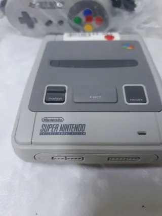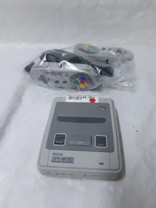 Consola Super Nintendo con dos mandos incluidos. Ideal para revivir la nostalgia de los videojuegos clásicos. - Incluye consola. - Dos mandos grises. - Cableado no especificado.