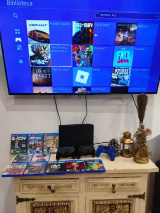 Se vende consola PlayStation 4 Slim de 500 gb en color negro. Incluye 3 mandos y una colección de 10 videojuegos + Juegos internos. - Consola PS4 Slim 500 TB. - 3 mandos DualShock 4. - Juegos incluidos: - FC 24 - Formula 1 2021 - FIFA 17 - Ride 2 - FIFA 22 - MotoGP 24 - Ride 3 - Gran Turismo Sport - Tekken 7 - Rayman Legends