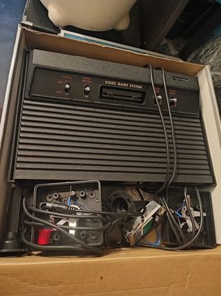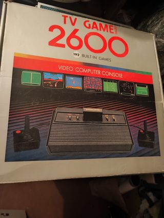 Consola de videojuegos clásica tipo Atari 2600. - Incluye 192 juegos incorporados. - Diseño retro en color negro. - Tienes dos mandos, pero la pestaña izquierda de los mandos estan rotas como se aprecia en las fotos, he hecho un apaño para poder jugar.