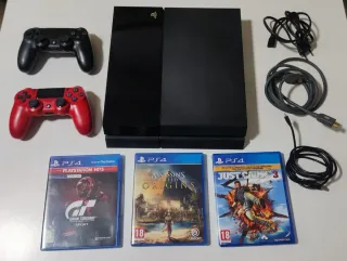 Pack PlayStation 4 en perfecto estado de funcionamiento, incluye: -PlayStation 4 -3 Cables (alimentación, HDMI Microsoft y carga de mandos) -2 mandos originales, el rojo en perfecto estado, el negro tiene un defecto en uno de los joystick (véase foto) y uno de los gatillos se engancha a veces. - 2 carcasas para mando, una de dragón ball y otra glow. -Videojuego Assassins Creed Origins -Videojuego Gran Turismo Sport -Videojuego Just cause 3
