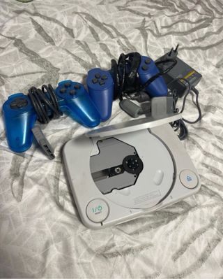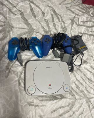 Consola de videojuegos clásica Sony PS one en color blanco, con tres mandos adicionales en color azul. - Incluye consola. - Dos mandos de control. - Cableado necesario.