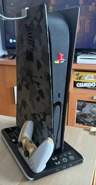 Lleva tu PS5 al siguiente nivel con este Pack Táctico Premium. Incluye la consola protegida por carcasas de camuflaje militar con rejillas laterales y un sistema exclusivo de doble ventilación trasera para máxima refrigeración. Completa tu setup con un mando DualSense personalizado en blanco y dorado, y una estación de carga vertical multifunción para mantener todo organizado y listo para la acción. Contenido del set: - PS5 con paneles ABS de alta calidad. - Placas de camuflaje con flujo de aire optimizado. - Extractores traseros anticalentamiento. - Mando Gold & White. - Base de carga rápida.