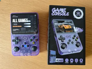 Consola de videojuegos portátil R36S en color morado translúcido. 64gb.