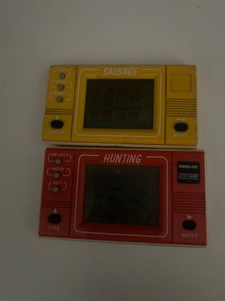 Dos consolas de juegos LCD portátiles, una amarilla y otra roja. Ambas son de la marca INNO-HIT y modelos LCD GAME. Funcionando las dos - Consola amarilla con juego SAUSAGE. - Consola roja con juego HUNTING. Tiene un botón un poco hundido - Botones de control en ambos lados de la pantalla. Les falta la tapa de pilas Precio por las dos