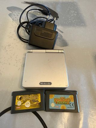 Consola portátil Nintendo Game Boy Advance SP en color plateado. Incluye cargador y dos cartuchos de juego. - Harry Potter y la Piedra Filosofal - Hamtaro: Ham-Ham Heartbreak Hago envios a trabes de la app