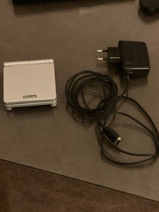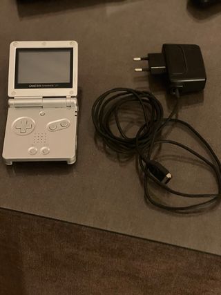 Consola portátil Game Boy Advance SP en color plateado. Incluye cargador. - Diseño plegable. - Pantalla integrada. - Botones de control.
