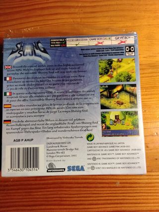 Juego Shining Soul para Game Boy Advance en perfecto estado. Se incluye la caja y el cartucho. ¡Un clásico RPG de Sega listo para jugar! - Versión PAL Española. - Juego completo en su caja original. - Cartucho y caja en excelentes condiciones. Conserva el precinto, solo abierto por arriba. No tiene puntos VIP Todo original 100%