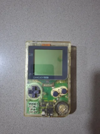Consola portátil Game Boy Pocket con carcasa transparente. - Diseño clásico de Nintendo. - Pantalla de juego. - Botones de control.