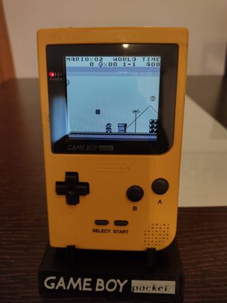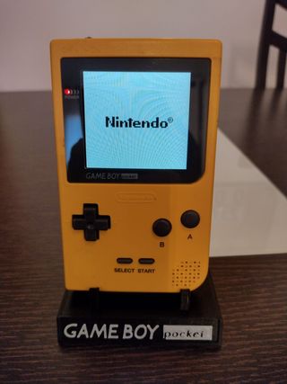 Game Boy Pocket amarilla. Se le ha instalado una pantalla LCD IPS con retroiluminación y siete modos de color diferentes. Control táctil en el borde superior de la carcasa frontal para cambiar entre modos. Se envía con el soporte expositor que aparece en las imágenes. No incluye juego. Cualquier duda, preguntar sin compromiso.
