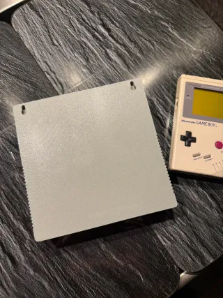 Expositor para la consola Nintendo Game Boy. - Incluye espacio para la consola y dos cartuchos de juegos. - Diseño en color gris y beige o se puede imprimir en otros colores.