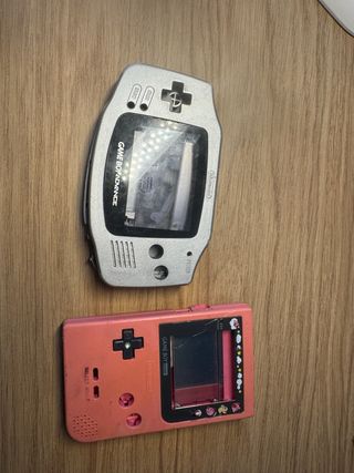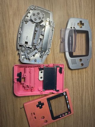 Conjunto de carcasas para consolas Game Boy. - Carcasa plateada para Game Boy Advance. - Carcasa rosa para Game Boy Color.
