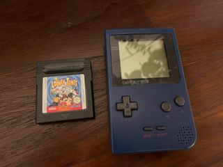 Consola portátil Game Boy Pocket en color azul, junto con el cartucho del juego Looney Tunes. - Incluye cartucho de juego. - Diseño compacto y portátil.