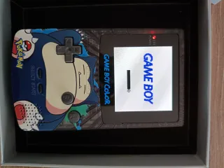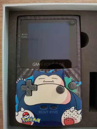 Consola portátil Game Boy Color con un diseño único de Snorlax. - Pantalla con tecnología AMOLED. - Carcasa personalizada con Snorlax y Pokémon.