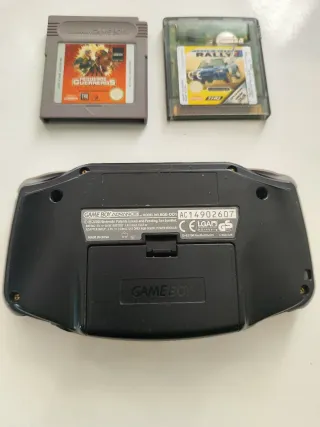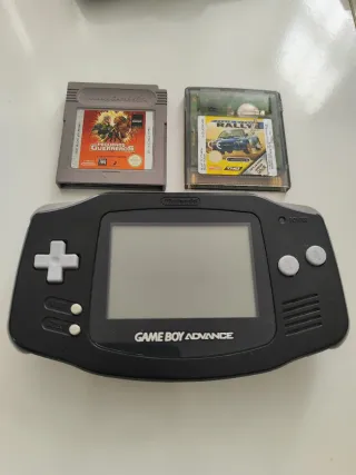 Consola portátil clásica en color negro, ideal para coleccionistas y amantes de los videojuegos retro. Incluye dos cartuchos de juegos. - Consola Game Boy Advance. - Juego Pequeños Guerreros para Game Boy. - Juego Rally para Game Boy Advance.