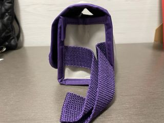 Práctica bolsa organizadora de la marca NUBY, ideal para guardar cartuchos de Gameboy. - Color gris claro con ribete morado. - Cierre de solapa. - Asa lateral de tela morada.