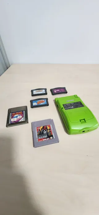 Consola portátil clásica en color verde vibrante. Perfecta para coleccionistas y amantes de los videojuegos retro. - Incluye varios cartuchos de juegos. - Diseño icónico y portátil.