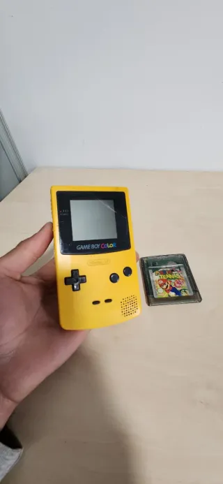 Consola portátil Game Boy Color en color amarillo. Incluye el juego Mario Tennis. - Pantalla con algunas grietas. - Incluye cartucho de juego Mario Tennis.