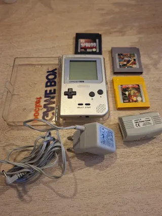 Consola portátil clásica Nintendo Game Boy Pocket en color plata. Incluye accesorios para su uso y disfrute. - Consola Game Boy Pocket MGB-001. - Funda protectora transparente. - Adaptador de corriente AC-DC. - Cubierta GBA Power Cover. - Cartuchos de juego: PR099, Capcom, Super Mario Land.