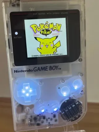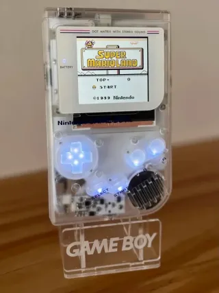 Game Boy original mejorada profesionalmente con componentes de alta calidad. PCB mejorada con CPU original de Super Game Boy, totalmente compatible con cartuchos originales. Pantalla IPS moderna con retroiluminación brillante, diferentes modos de imagen y scanlines. Tarjeta de audio dedicada de bajo ruido con altavoz de 1W y botones táctiles mejorados. Incluye batería LiPo recargable de 2000mAh, cable USB de carga y funda protectora impresa en 3D. La carcasa puede mostrar líneas de estrés por el proceso de fabricación del ABS transparente. Totalmente probada y funcional.
