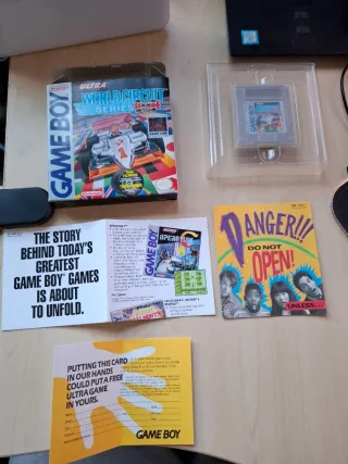 Le falta el manual. Incluye la caja original y el cartucho del juego World Circuit Series para Game Boy. - Caja del juego. - Cartucho del juego. - Folleto The Story Behind Today's Greatest Game Boy Games. - Folleto Danger!!! Do Not Open!. - Tarjeta de registro Putting this card in our hands could put a free ultra game in yours.