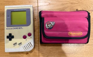 Consola portátil clásica Nintendo Game Boy con su funda original. - Color beige de la consola. - Funda de color rosa con diseño de Mario. - Logo de Nintendo en la funda.