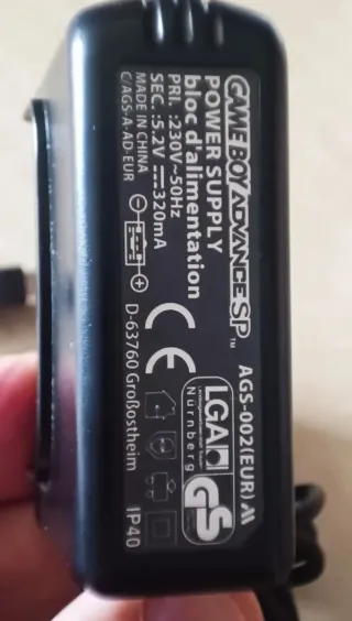 Adaptador de corriente para Game Boy Advance SP. - Modelo: AGS-002(EUR) - Entrada: 230V~50Hz - Salida: 5.2V 320mA - Fabricado en China - Certificación CE y GS - Protección IP40