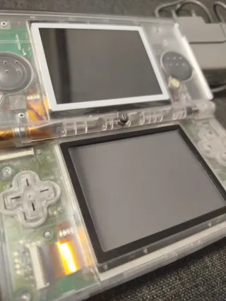 Consola portátil Nintendo DS Lite con un diseño transparente. Componentes originales, a excepción de la carcasa totalmente nueva. Ideal para llevar tus juegos a todas partes. Incluye lápiz táctil, consola y cargador. Funciona perfectamente, leyendo cartuchos de DS y Game Boy, carga sin problema. Las fotos son reales y muestran exactamente el producto en venta y su estado. Pantallas en buenas condiciones.