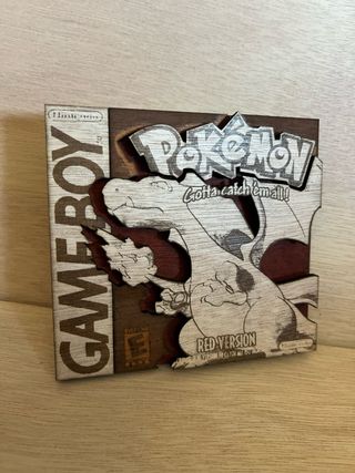Réplica de la carátula del videojuego Pokémon Rojo para Game Boy, elaborada en madera. - Tamaño real de caja de Gameboy Pieza unica
