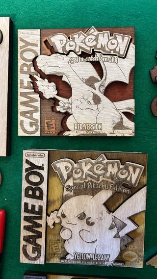 Piezas artesanales unicas. Conjunto de carátulas de madera para Game Boy con temática de Pokémon. - Diseño de Pokémon Red Version. - Diseño de Pokémon Blue Version. - Diseño de Pokémon Pikachu Edition. - Material: Madera. Tamaño real de la caja de gameboy