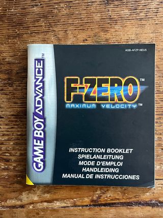 Manual de instrucciones para el juego F-Zero Maximum Velocity de Game Boy Advance. - Título del juego: F-Zero Maximum Velocity. - Plataforma: Game Boy Advance (GBA). - Incluye instrucciones en varios idiomas.