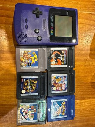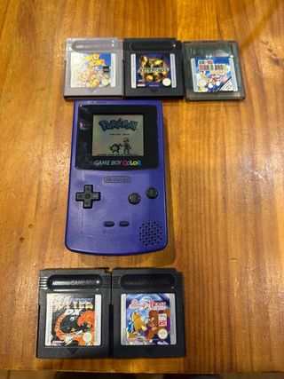 Vendo mi Game Boy Color en color morado. Está en buenas condiciones, con algunos signos normales de uso. Incluye seis juegos: Pokémon Amarillo, Donkey Kong Land, Super Mario, Asteroids, Disney's Beauty and the Beast, Mickey's Speedway USA y Disney's The Lion King. - Consola Game Boy Color morada. - Seis juegos clásicos de Game Boy. - En buen estado.
