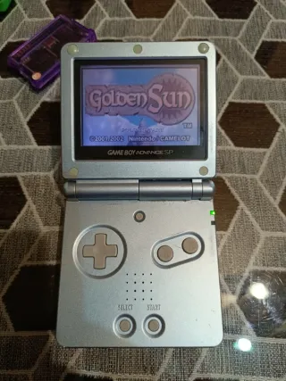 Consola portátil Game Boy Advance SP en color azul. Diseño plegable y compacto. - Pantalla retroiluminada. Con cargador de pared y de coche Estuche, pegatinas de skins 5 juegos y cartucho con todos los juegos en tarjeta sd Parte superior con algunos arañazos