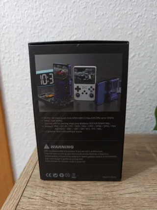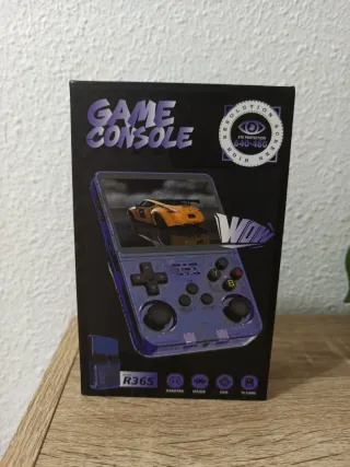 Consola de juegos portátil R36S con pantalla de alta resolución. - Diseño transparente morado. - Botones de control completos. - Soporte para tarjeta TF.