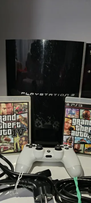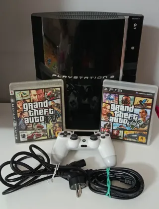Consola Playstation 3 en color negro, ideal para disfrutar de tus juegos favoritos. - Incluye los juegos Grand Theft Auto IV y Grand Theft Auto V. - Viene con un mando inalámbrico. - Incluye cables de conexión. (Consola con signos de desgaste estético SEGA Nintendo PlayStation Game boy advance NES SNES Neo geo