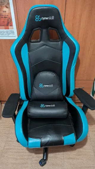 Silla de estilo gaming en color azul y negro. Diseñada para ofrecer comodidad. Se regala también funda. - Tapicería en polipiel. - Cojín lumbar incluido. - Reposacabezas integrado.