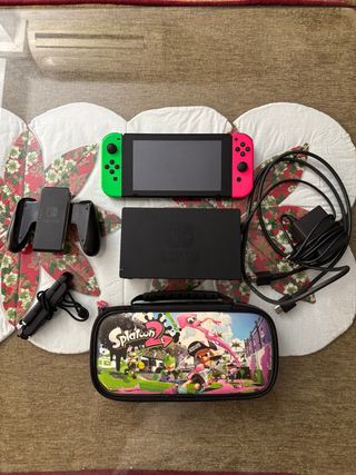 Consola Nintendo Switch con accesorios. Incluye: - Joy-Con Splatoon 2 (verde y rosa) - Soporte para los mandos y correas -Cargador original y cable HDMI - Estuche Splatoon 2 Observación: Los mandos tienen drift, pero se puede jugar en condiciones normales.