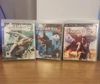 Pack de tres videojuegos de la saga Uncharted para PlayStation 3. - Uncharted: El Tesoro de Drake - Uncharted 2: El Reino de los Ladrones - Uncharted 3: La Traición de Drake Pal 🇪🇸. Discos y cajas en perfecto estado, sin manuales.