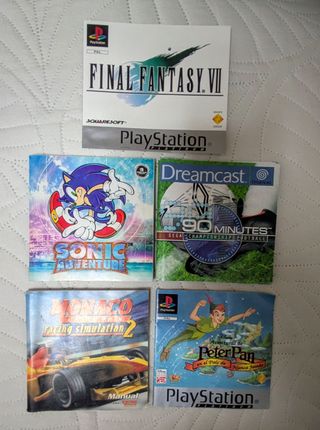 Lote de manuales y carátulas para videojuegos de PlayStation 1 y Dreamcast. Incluye títulos icónicos. Final Fantasy 7, Sonic Adventure, 90 minutes Championship Football, Monaco Grand Prix Racing Simulation 2, Peter Pan - Final Fantasy VII (PlayStation Platinum) - Sonic Adventure (Dreamcast) - 90 Minutes Sega Championship Football (Dreamcast) - Monaco Racing Simulation 2 (PlayStation) - Aventuras de Peter Pan en el País de Nunca Jamás (PlayStation)