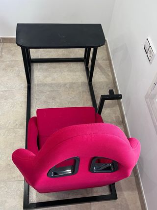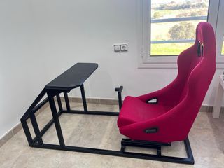 Cockpit de simulación de carreras con asiento deportivo. - Estructura metálica negra. - Bcket deportivo de color rojo Mracing - Fabricado por herrero - Con soporte para cambio de marchas - Asiento con guias ajustables para poder disfrutar jugando diferentes personas (tanto adultos como niños)