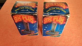 Pack de dos joysticks para Sinclair Spectrum. Uno de ellos funciona perfectamente, el otro a veces falla el eje. - Diseñados para los modelos +2 y +3. - Incluyen cable de conexión. - Caja original.