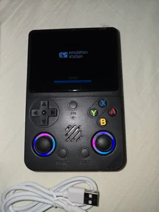 Consola portátil con un diseño moderno y llamativo. - Pantalla con logo de Emulation Station. - Botones de control frontales. - Joysticks con iluminación LED multicolor. - Incluye cable de carga USB. Está sin un arañazo y apenas o nada usada. Todabia tiene el protector de pantalla.
