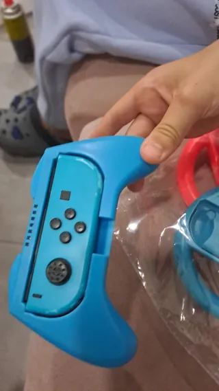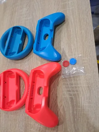 Accesorios para Nintendo Switch en color azul y rojo. - Dos carcasas para mandos. - Dos volantes. - Incluye tapas para joysticks.