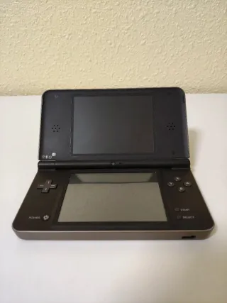 Consola Nintendo DSi XL en color negro, con lápices táctiles, cargador y tarjeta M3. - Lápiz táctil principal. - Lápiz táctil secundario. - Tarjeta M3. - Adaptador de corriente.