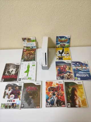 Wii Blanca con base 3 mandos + Nunchuk Accesorios de conexión a TV *Todos los juegos incluyen manual de instrucciones* Lego Indiana Jones We Rock Disaster Day of Crisis Wii Fit Fifa 10 ZeldaTwilight Princess Wii Sports Inazuma Eleven Strikers Wii Sports Resorts Spiderman Amigo o Enemigo Narnia el Príncipe Caspian Guilty Gear XX