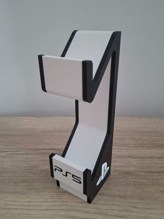 Soporte diseñado para mandos de PlayStation 5. Presenta un acabado bicolor en blanco y negro, con el logo de PS5 y el símbolo de PlayStation. - Diseño moderno y funcional. - Colores: Blanco y negro. - Incluye logo PS5. - Incluye símbolo PlayStation. - 100% Plástico