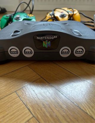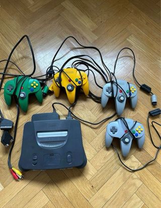 Nintendo 64 original en muy buen estado, con 4 mandos (verde, amarillo y dos grises) y todos los cables necesarios. Lista para enchufar y jugar al momento, ideal para multijugador y para quien quiera una consola retro cuidada y funcionando perfectamente.