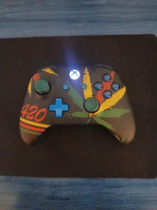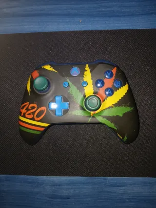 Mando de Xbox con un diseño único y llamativo. - Diseño con hojas verdes y detalles en rojo, amarillo y naranja. - Número 420 en un lateral. - Botones frontales en azul.