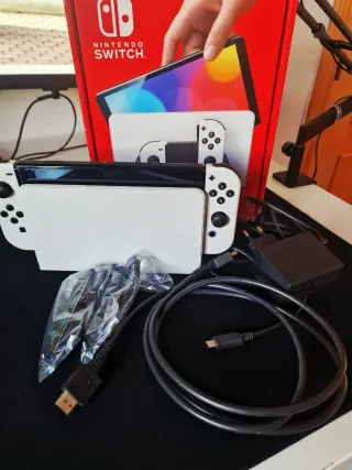 Consola Nintendo Switch OLED en blanco y negro, junto con un mando Pro. - Pantalla OLED de 7 pulgadas. - Base de consola blanca. - Mando Pro negro. Está como nueva, la vendo por cambiar a switch 2, he incluye caja original.